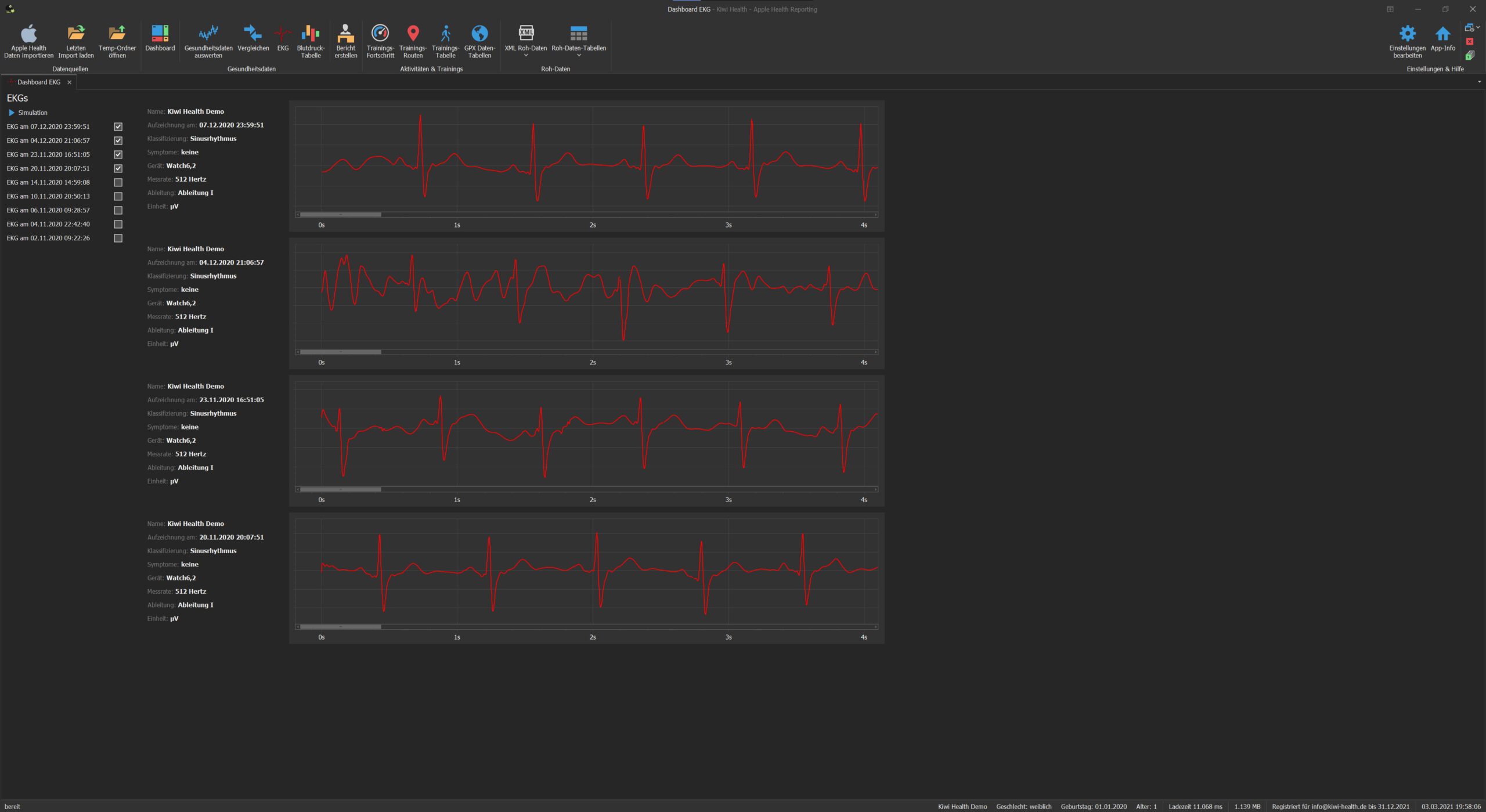 Gallery Screenshots DashboardBlood pressure chartBMI-ChartECGComparisonSplit-Screen horizontallySplit-Screen verticallyTraining ProgressComparison of your training progressGPX-DataRaw-DataReport SelectionPDF-ReportPrint PreviewRoute MapLight Mode More screenshots from the current version Favorites DashboardActivities and TrainingsSleep AnalysisNutrition Analysis part 1Nutrition Analysis part 2Nutrition Analysis part 3Health Calendar Videos Dashboard Split screen and window docking Create report Highlight feature in March 2021 update:Playback of the recorded ECGs